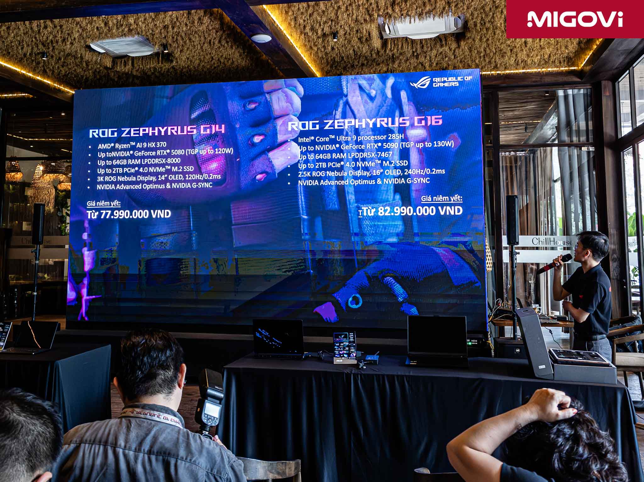 - ASUS ROG Zephyrus G14 - Laptop chơi game màn hình 14 inch mạnh nhất thế giới, có mức giá từ 77,990,000 đồng cho cấu hình AMD Ryzen AI 9 HX 370/RTX 5070 Ti Laptop/RAM 64 GB/SSD 2 TB. Phiên bản sử dụng RTX 5080 Laptop có mức giá 95,990,000 đồng.