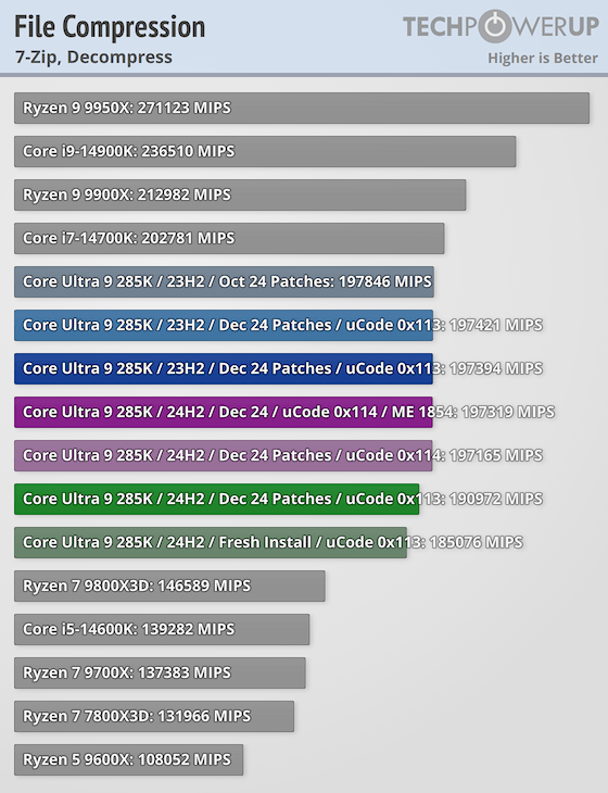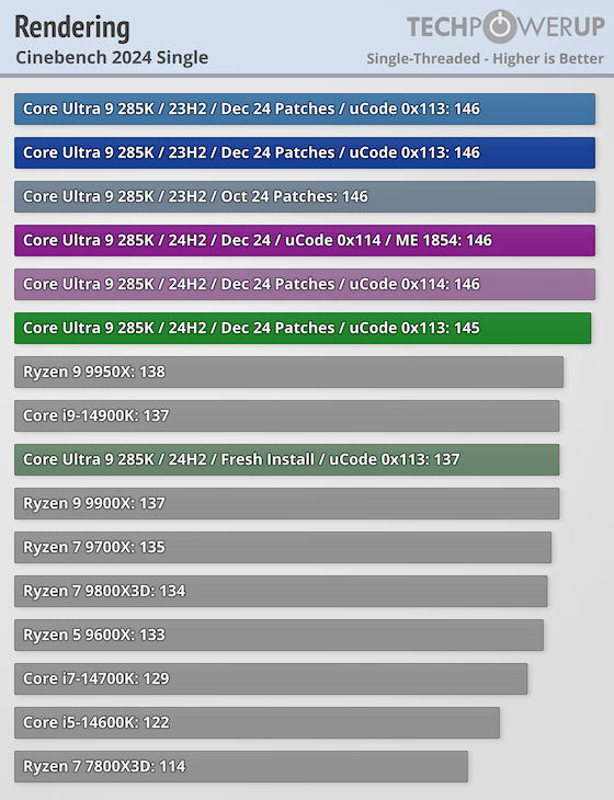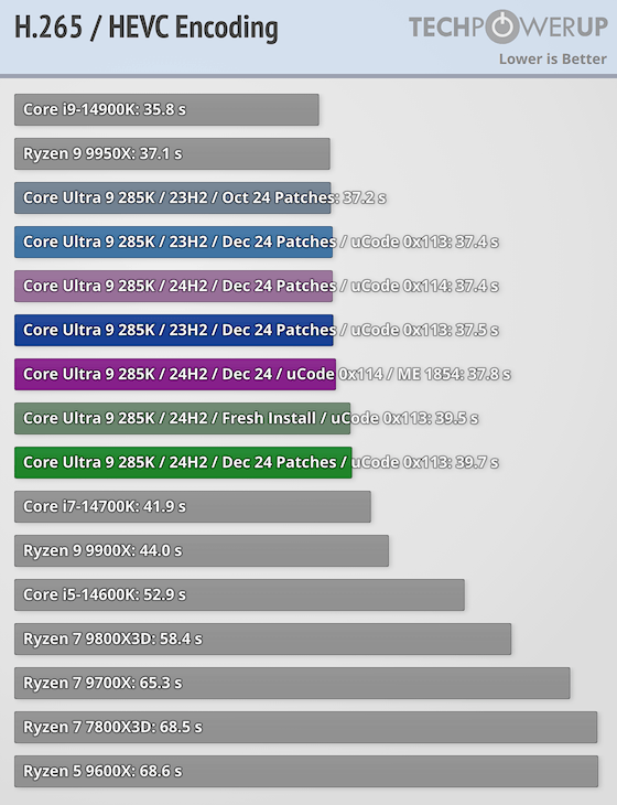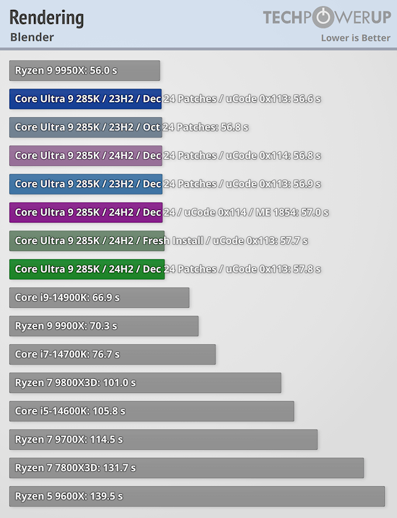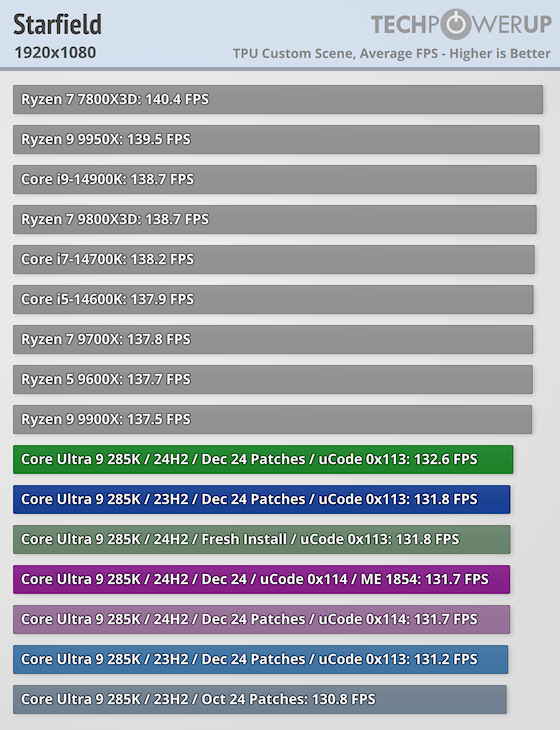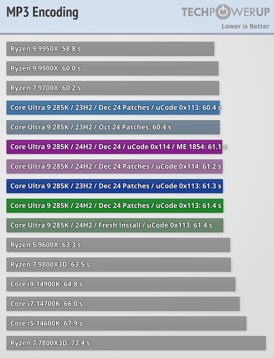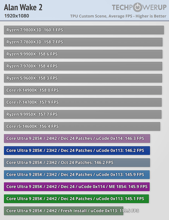 Tuy vậy, kết quả mà TPU ghi nhận được mang lại "cảm xúc lẫn lộn". Chi tiết cần nói là Windows 11 24H2 bản gốc (Fresh Install) đúng là có vấn đề. Trong nhiều trường hợp hiệu năng trên 24H2 còn thấp hơn cả 23H2 (lý do mà TPU không dùng 24H2 khi ARL-S vừa ra mắt). Mọi thứ khả quan hơn sau khi cập nhật Windows cho 24H2. Song mọi thứ tốt đẹp dừng lại ở đó. Bản uCode 0x114 gần như không có khác biệt nào về hiệu năng so với 0x113. Do đó tuyên bố cải thiện 6-30% hiệu năng của Intel chỉ là gió thoảng...