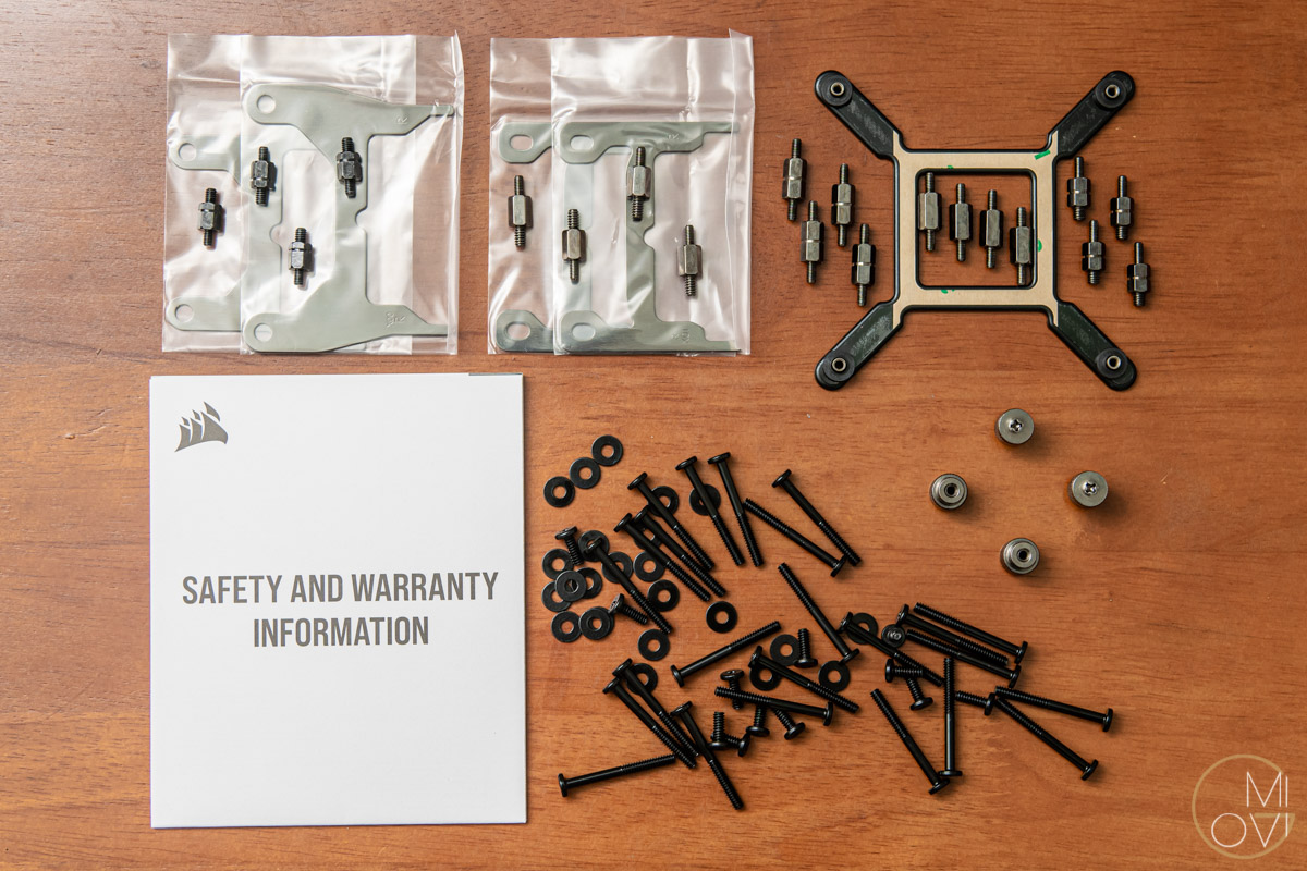 Phụ kiện đi kèm của Corsair iCUE H150i ELITE LCD rất đầy đủ và nhiều, hỗ trợ những socket phổ biến hiện tại như Intel LGA 1700/1200/115x/1366/20xx và AMD AM4/AM5/sTRX4/sTR4. Ngoài lượng ốc cần thiết để lắp đặt lên socket CPU, Corsair còn hào phóng tặng kèm 24 ốc dài gắn quạt và 24 long đền, sẵn sàng cho thiết lập 6 quạt push - pull trên radiator. Dĩ nhiên với 12 bộ ốc và long đền là cũng đủ nếu như chỉ cố định quạt bằng 2 ốc, nhưng sự chăm chút và tỉ mỉ của Corsair không chỉ đơn giản như vậy.