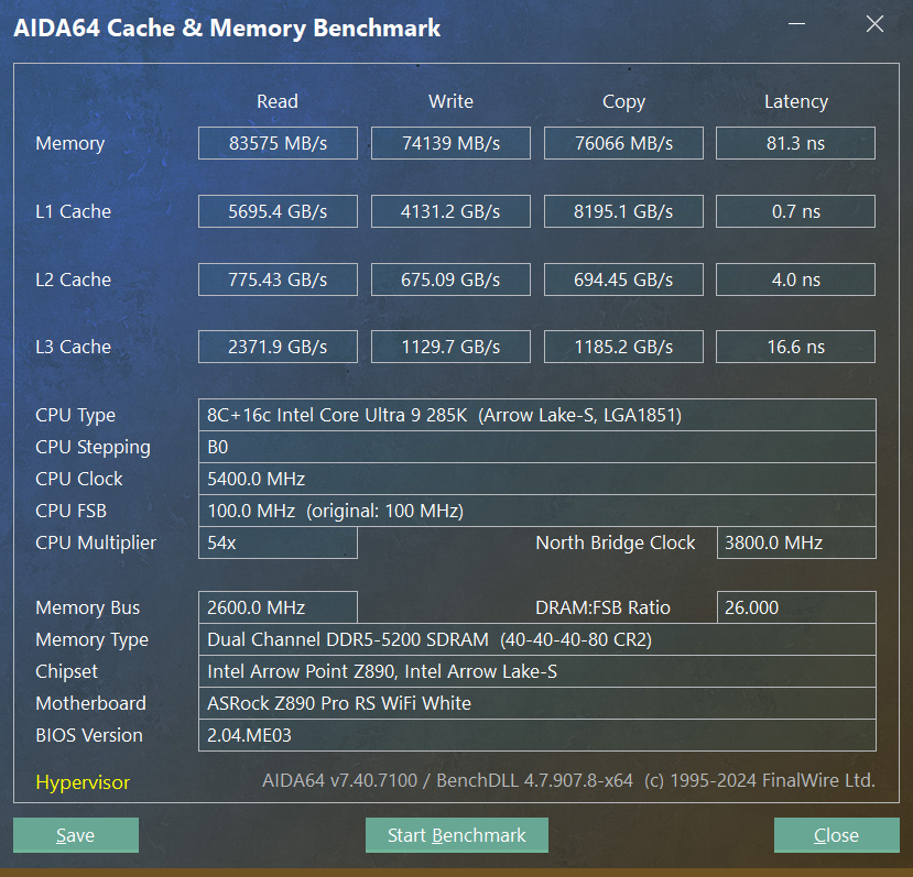 Hiệu năng RAM được đo bằng phần mềm AIDA64 ở profile XMP theo nhà sản xuất công bố - DDR5-5200 CL40.