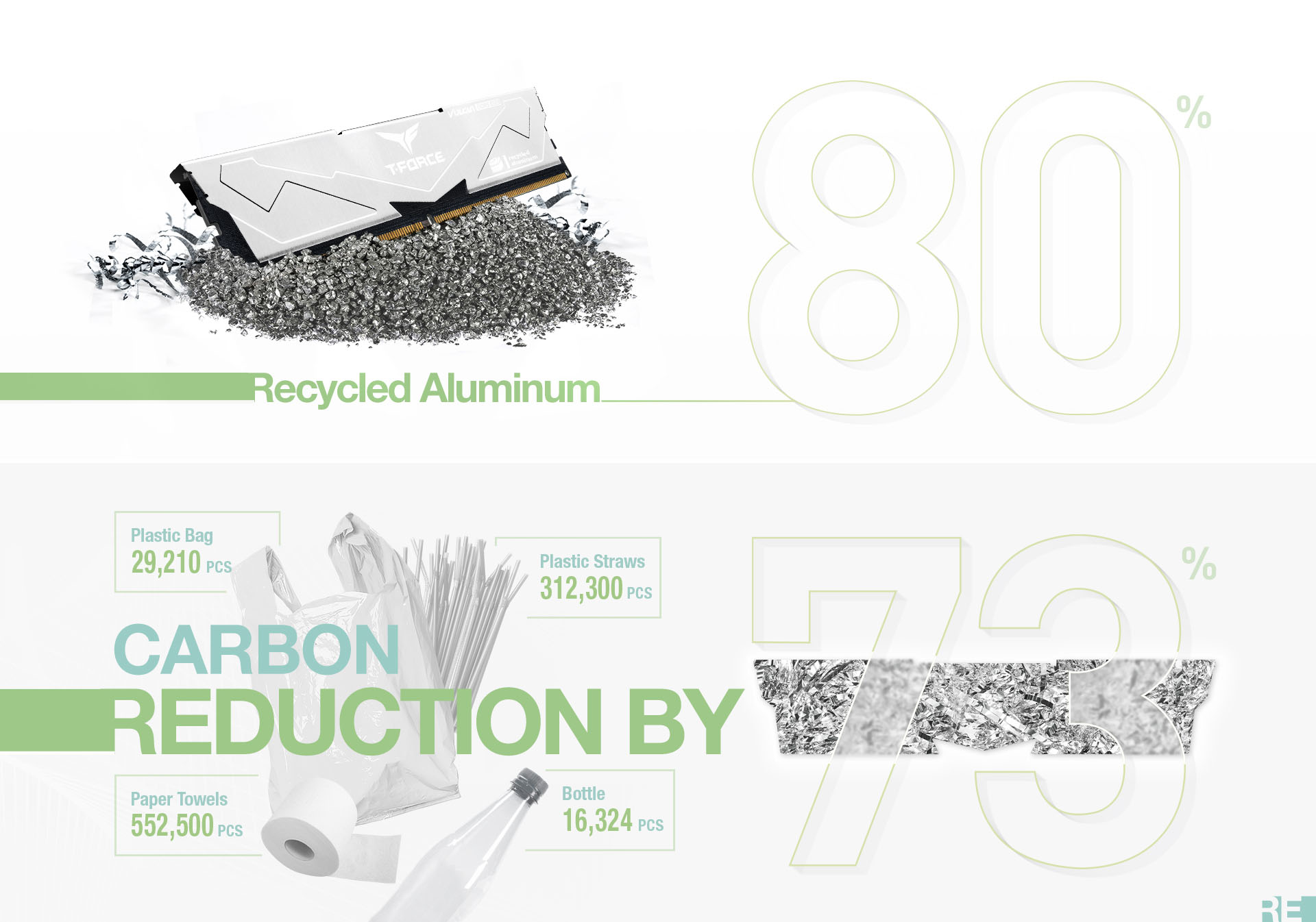 Đừng vội đánh giá TEAMGROUP T-FORCE VULCAN ECO DDR5 qua chữ ECO vốn thường hay gắn liền với ý nghĩa tiết kiệm, giá rẻ hay chất lượng tầm tầm. ECO trong sản phẩm liên quan tới vấn đề tái chế, hay đúng hơn, đây là giải pháp bộ nhớ DDR5 đầu tiên trong ngành công nghiệp sở hữu khả năng ép xung đáng gờm nhưng vẫn thân thiện với môi trường và có tính bền vững. Theo đó, chính lớp nhôm tản nhiệt của thanh RAM được sản xuất bằng vật liệu nhôm tái chế, chiếm 80%, từ đó giảm thiểu tới 73% khí thải carbon trên mỗi tản nhiệt này. Giảm 73% lượng carbon thải ra nghĩa là tương đương với 29,210 túi nhựa, 552,500 cuộn giấy vệ sinh, 312,300 ống hút nhựa hay 16,324 chai nhựa. Những con số khổng lồ này nếu như không có giải pháp giảm bớt, chắc chắn sẽ rất nhanh chóng gây hại tới môi trường sống vốn đã không còn lành lặn hiện nay.