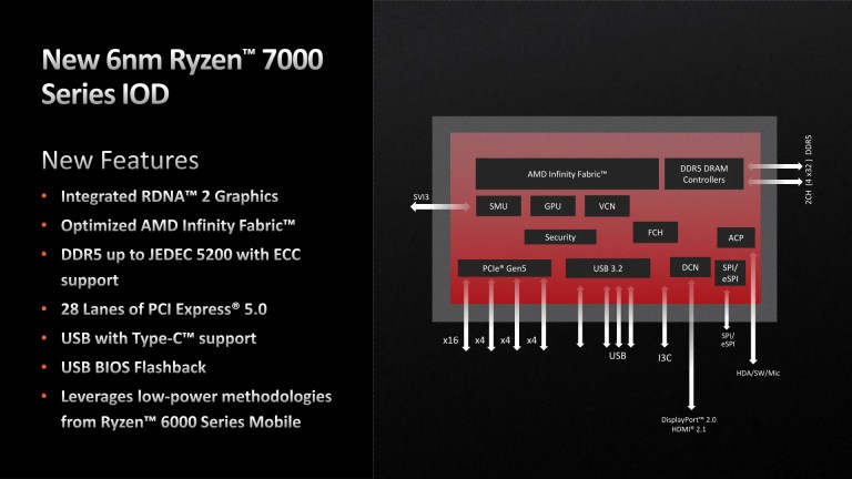 Die IOD cũng có đợt đại tu mới. Tuy không đóng góp nhiều vào benchmark sức mạnh nhưng IOD có vai trò liên kết với các thành phần khác của thiết bị (chipset tích hợp). Các review về Ryzen thường "chê" việc con chip này tốn điện hơn mức cần thiết khi hệ thống idle (không áp dụng với thiết kế monolithic không có IOD). Một phần nguyên nhân ở chỗ IOD hay được sản xuất trên tiến trình cũ hơn CCD (hiện tại là 6 nm). Với việc "lên đời" tiến trình N4C, hy vọng mức tiêu thụ điện idle của Ryzen sẽ giảm đi đáng kể. Ngoài ra tiến trình mới còn mở ra khả năng AMD có thể trang bị một IGP tốt hơn trước. Hiện tại IGP trên Ryzen chủ yếu chỉ để lên hình, sức mạnh đồ hoạ đã bị Intel đuổi kịp, cũng là lúc cần được nâng mới.