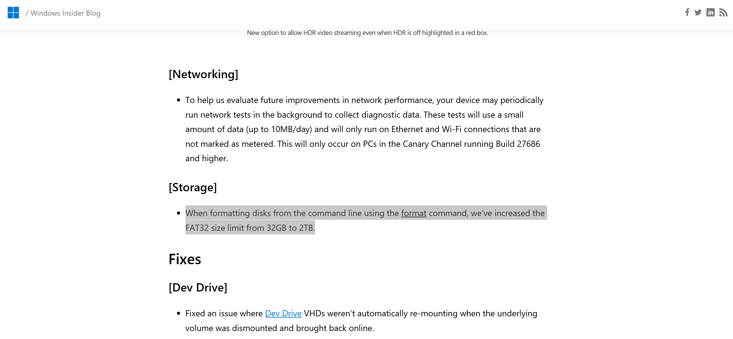 Trong bản cập nhật Windows 11 Insider Preview Build 27686, Microsoft đã mở rộng khả năng hỗ trợ của FAT32 lên dung lượng lớn nhất 2 TB.