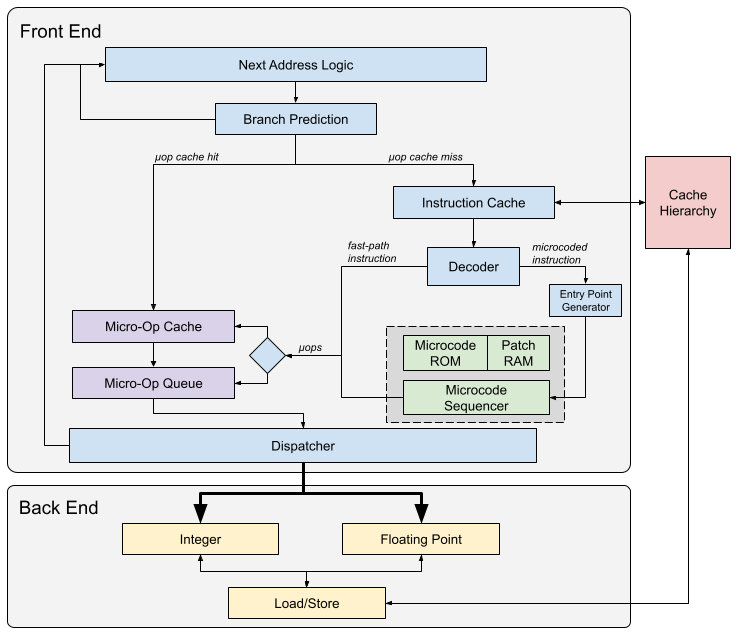 Mặc dù x86 (trên chip Zen) là kiến trúc đã tồn tại được nửa thế kỷ. Và từ đầu chúng dựa trên thiết kế tập lệnh phức tạp (CISC). Thì ngày nay điều đó không chính xác nữa. Thực tế sau nhiều thập kỷ "tiến hoá", CISC chỉ còn là "cái vỏ bên ngoài". Sau quá trình giải mã (decode), các tập lệnh x86 được "băm nhỏ" thành các vi lệnh/vi mã (micro-op/microcode). Cấu trúc các vi mã này trên thực tế y hệt các tập lệnh rút gọn (RISC). Song AMD lẫn Intel không công bố thông tin chi tiết về các tập lệnh RISC này, họ vẫn duy trì "cái vỏ" CISC bên ngoài. Bạn có thể xem lại bài phân tích sau để hiểu hơn vấn đề.