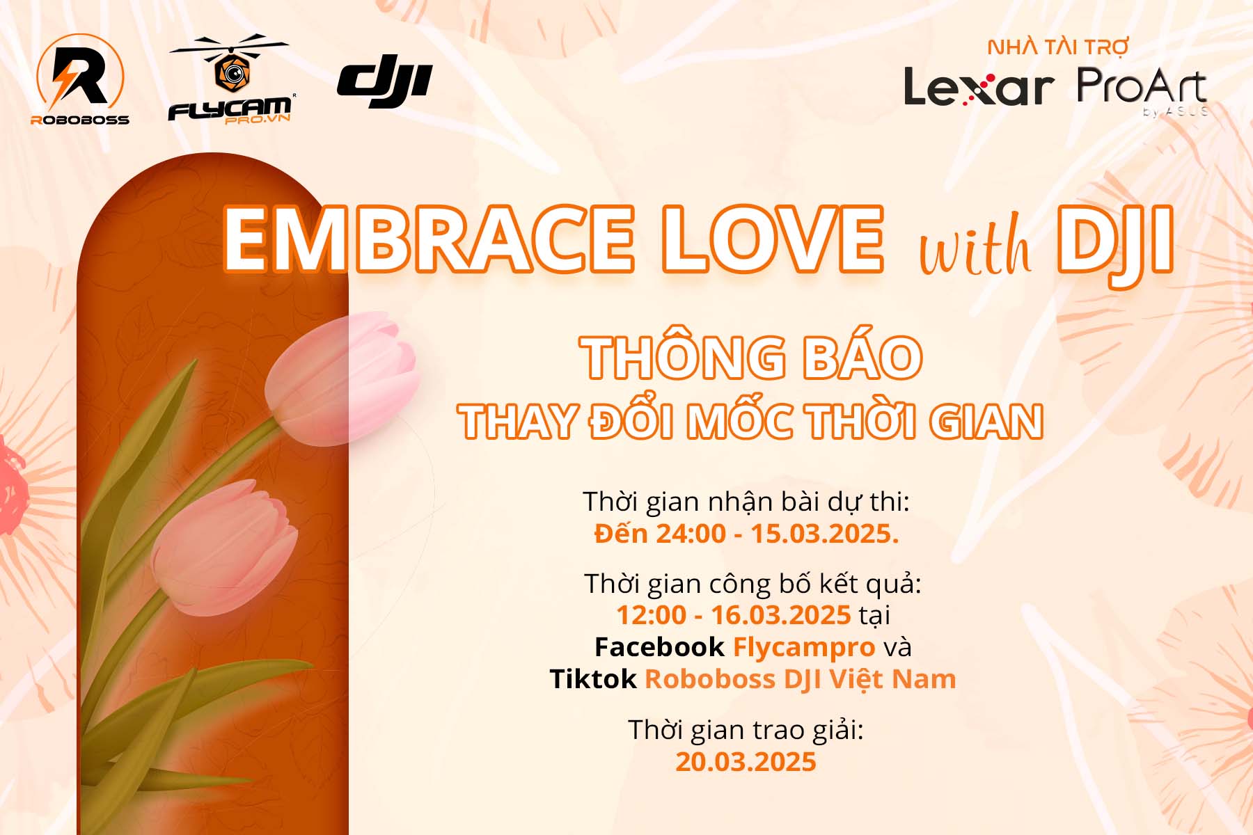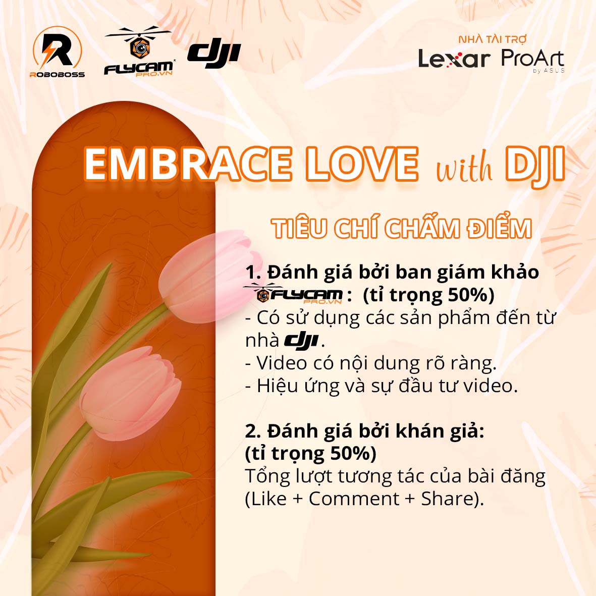 Ngay trong sự kiện New Stuff for Newbie giới thiệu 2 mẫu gimbal là DJI Osmo Mobile 7 Series và DJI RS 4 Mini, đội ngũ Roboboss đã phát động cuộc thi sáng tạo cho người dùng DJI tại Việt Nam. Theo đó, cuộc thi Embrace Love with DJI là cơ hội để khách hàng sử dụng sản phẩm DJI có thêm sân chơi mới, đồng thời là nhiều cơ hội nhận quà giá trị, nhân dịp ngày Quốc tế Phụ nữ 8/3 năm nay. Hãy nhanh chóng tham dự chỉ với 2 bước đơn giản: