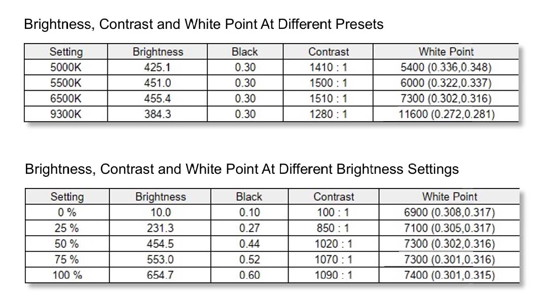 I tried measuring with the SpyderX Elite device in the Native mode of the screen, the results were even better than the company announced. Specifically, the screen covers 100% of the sRGB color space, 99% of the DCI-P3 color space, 88% of AdobeRGB, 86% of NTSC. Brightness at 100% reaches 654 nits, contrast 1090:1. At the 6500K setting, the brightness reaches 455 nits, contrast 1510:1. The default color accuracy is highest at 1.81, lowest at 0.17, average at 0.65.