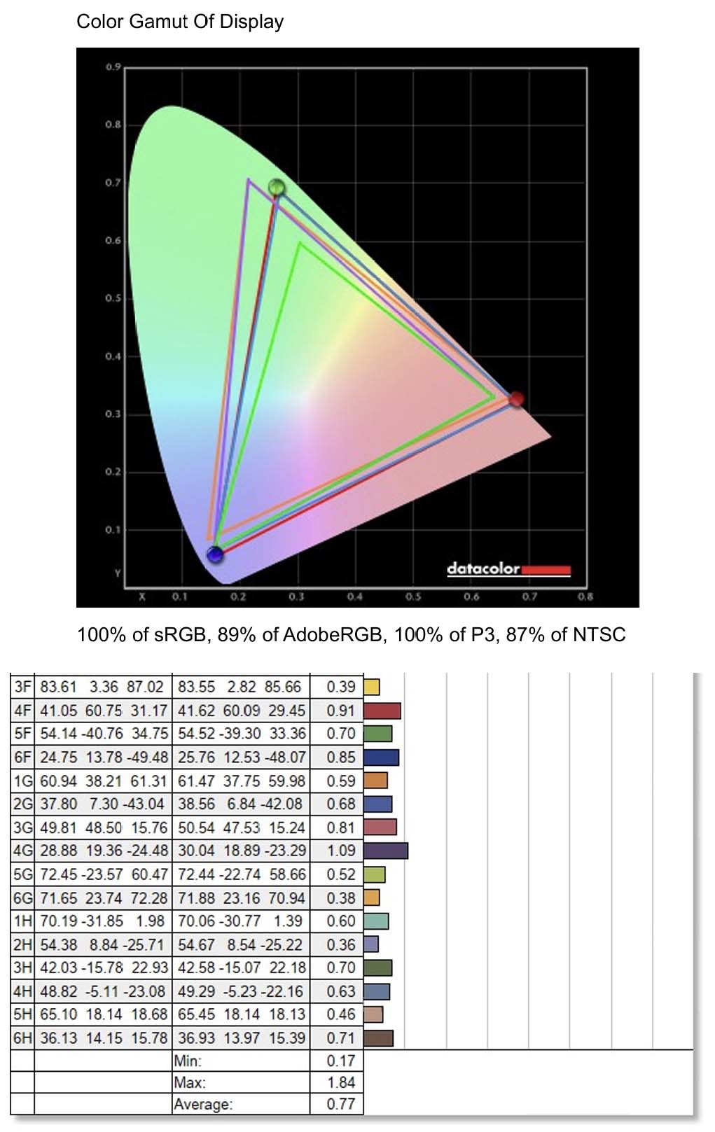 Also in Native mode, after calibration with SpyderX Elite, the results showed that the ProArt PA32QCV achieved 100% sRGB, 100% DCI-P3, 89% AdobeRGB and 87% NTSC. The lowest color accuracy was 0.17, the highest was 1.84 and the average was 0.77. These are extremely impressive numbers, especially for those who are extremely picky about color accuracy. When a monitor has accurate color, you will save a lot of time in editing and post-production to produce the final product.