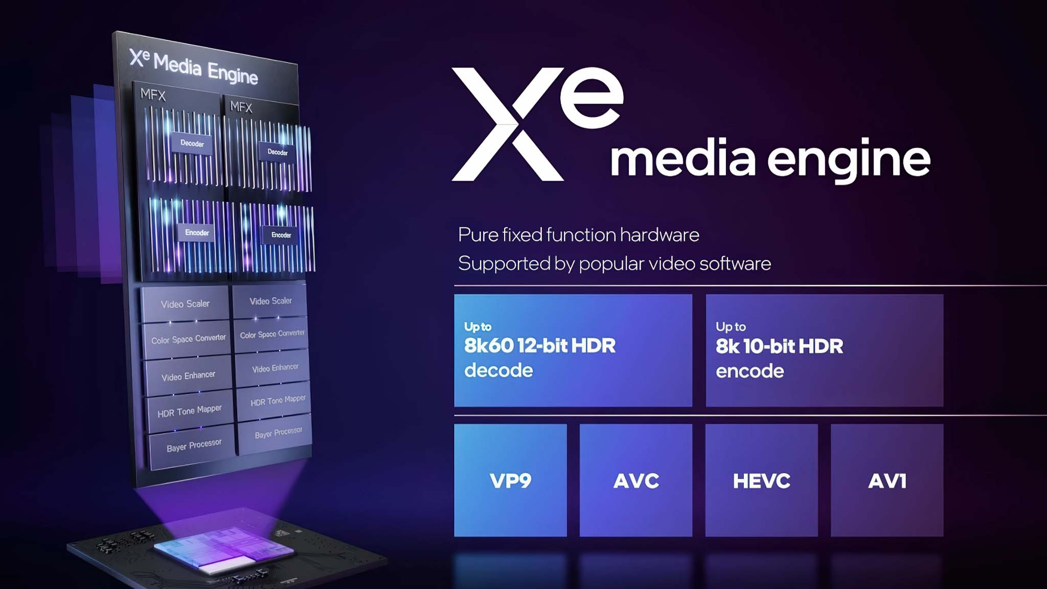 The Intel Arc B580 features two multi-format transcoder (MFX) engines, providing hardware encoding and decoding for the most popular video codecs today, including AV1, H.265 (HEVC), H.264 and VP9. The Arc B580’s unique competitive advantage in the content creation space is its hardware decoding of the 10-bit HEVC 4:2:2 codec. This format is popular in professional workflows, but is often not supported by hardware acceleration on competitor’s mainstream graphics cards.