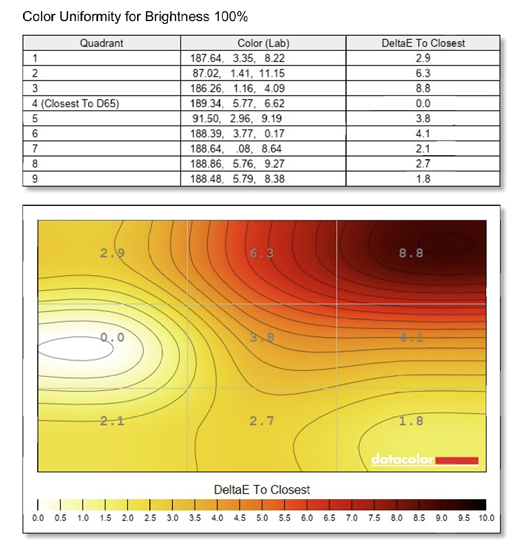 At the default setting without color calibration, the screen has a maximum brightness of 594.1 nits, the corresponding contrast is now 1320:1. When the brightness is set to 100%, the screen is brightest in the middle left corner, darkest in the upper right corner. The highest luminance difference is 14%. At 50% brightness setting, the screen is more uniform, brightest in the upper left corner and darkest in the upper right corner, the highest luminance difference is 18%.
