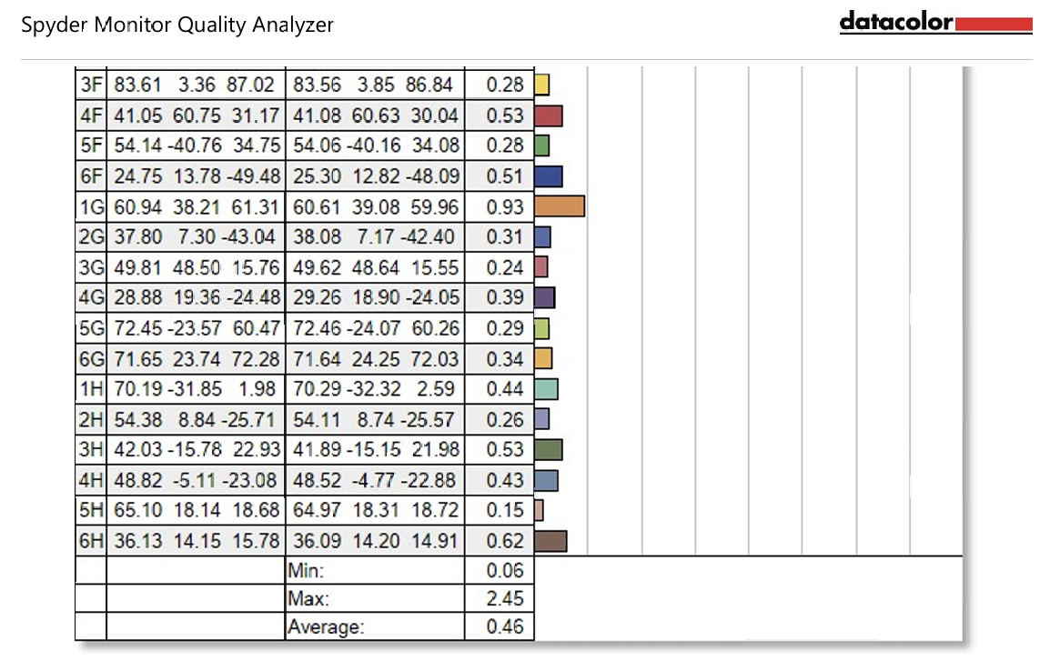 Migovi measured the ViewSonic ColorPro VP2788-5K monitor using the SpyderX Elite after performing a factory reset. The DCI-P3 display mode was enabled instead of User and the results showed that the monitor covered 100% of the sRGB color space, 89% of the Adobe RGB color space, 100% of the DCI-P3 color space and 87% of the NTSC color space. The color difference was as low as 0.06 and as high as 2.45 (teal), with an average Delta E of only 0.46.