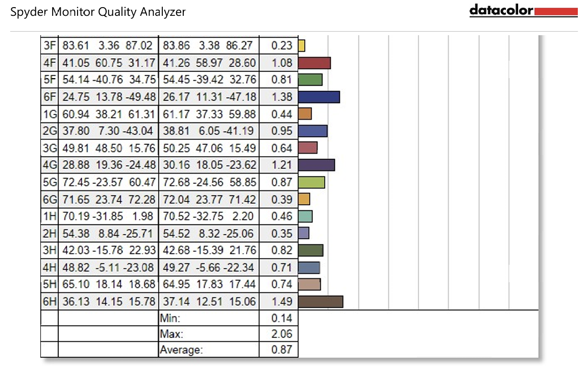 After performing calibration with SpyderX Elite, the results showed that the ViewSonic VP2788-5K achieved 100% sRGB, 90% Adobe RGB, 99% DCI-P3 and 88% NTSC. The color accuracy at this time was the highest at 2.06, the lowest at 0.14 and the average at 0.87.