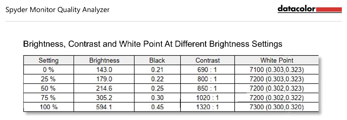 At the default setting without color calibration, the screen has a maximum brightness of 594.1 nits, the corresponding contrast is now 1320:1. When the brightness is set to 100%, the screen is brightest in the middle left corner, darkest in the upper right corner. The highest luminance difference is 14%. At 50% brightness setting, the screen is more uniform, brightest in the upper left corner and darkest in the upper right corner, the highest luminance difference is 18%.