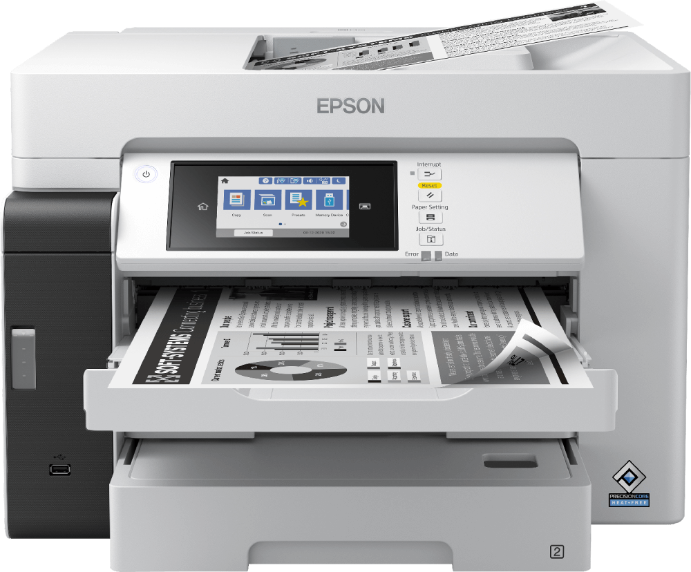 Công nghệ đầu in PrecisionCore cung cấp khả năng in ấn nhanh chóng và chất lượng cao cho Epson EcoTank M15180 | L15180. Máy có tốc độ in đến 25 ipm (image per minute), khay nạp tài liệu tự động đến 50 tờ cùng tính năng in 2 mặt. Hộp mực của máy có công suất in đến 7500 trang đen trắng và 6000 trang màu. Mực màu DURABrite cho ra các bản in chất lượng cao, chống nước, chống phai nhòe, phù hợp nhu cầu in trong doanh nghiệp.