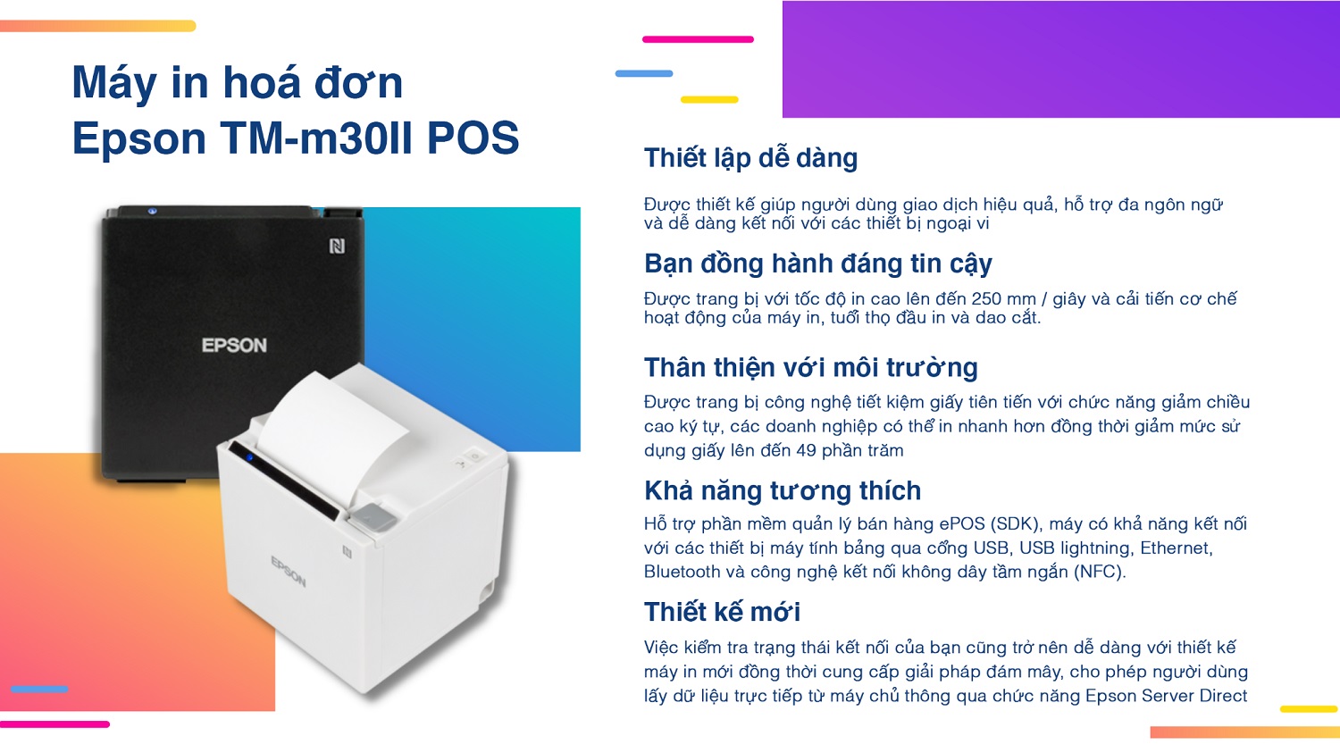 Epson TM-m30II POS (Point Of Sale) có nhiều cải tiến và nâng cấp nổi bật so với thế hệ trước như cấu hình và kết nối linh hoạt với thiết lập máy tính bảng, mang đến trải nghiệm thân thiện cho người dùng ở các doanh nghiệp ngành dịch vụ ăn uống hay bán lẻ, trong khi có hiệu quả vận hành cao. Máy có tốc độ in đến 250 mm/s với cơ chế hoạt động, đầu in, dao cắt được cải tiến, xử lý nhanh gọn các tác vụ trong giờ cao điểm. Epson TM-m30II giúp dễ dàng đọc phiếu đặt món trong nhà bếp mà không sợ rách giấy nhờ chức năng xoay 180 độ. Ngoài ra, sản phẩm còn có chức năng in chuyển tiếp, hỗ trợ đa ngôn ngữ Unicode, giúp in nhiều ngôn ngữ trên 1 biên lai đơn giản, nhanh chóng.