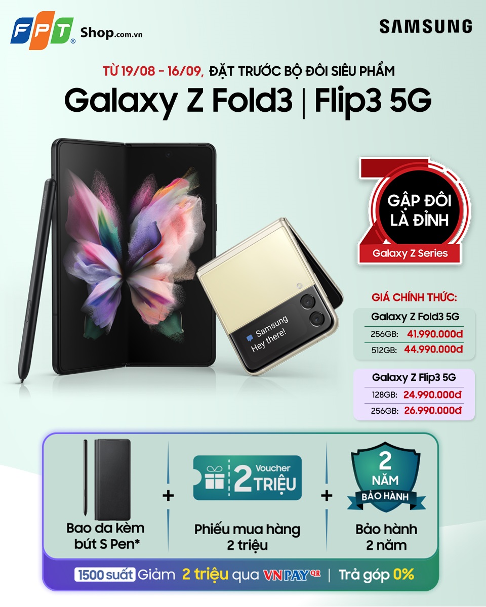 FPT Shop đã sớm triển khai chương trình đặt trước Galaxy Z Fold3 | Flip3 5G từ ngày 12/8, và đến 18/8 số lượng đơn đặt hàng tại chuỗi bán lẻ này vô cùng khả quan. Từ nay đến 16/9/2021, FPT Shop sẽ tiếp tục dành nhiều ưu đãi thiết thực cho khách hàng đặt mua bộ đôi siêu phẩm này. Ngoài ra, Samsung Việt Nam cũng đã công bố giá bán chính thức cho 2 mẫu điện thoại gập mới nhất năm nay.
