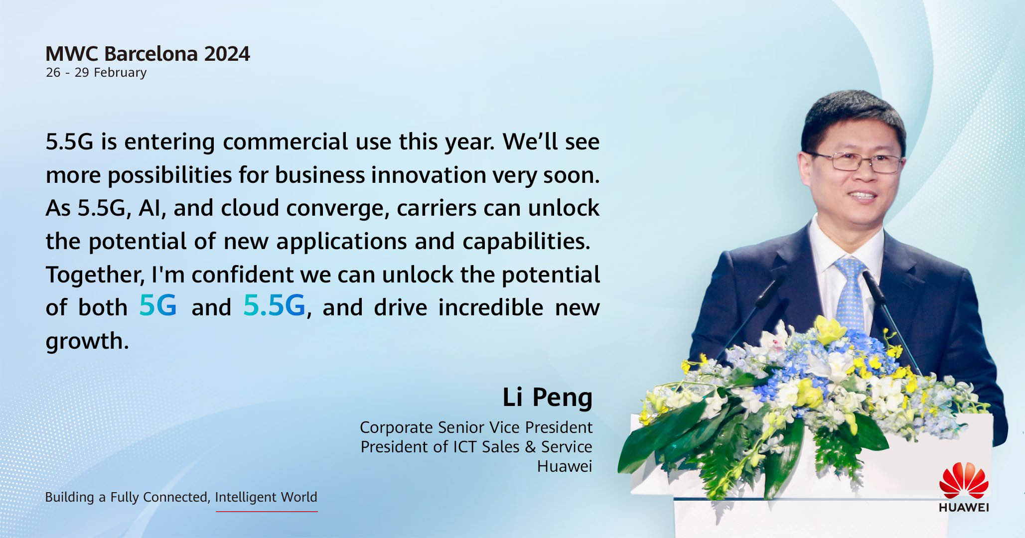 Kết thúc bài phát biểu tại hội nghị, ông Li Peng bày tỏ khát vọng: “Đồng hành cùng với các nhà mạng, Huawei sẽ khai phá tiềm năng của 5G và 5.5G vượt bậc hơn nữa, đồng thời thúc đẩy sự tăng trưởng mới bứt phá đầy kinh ngạc”.