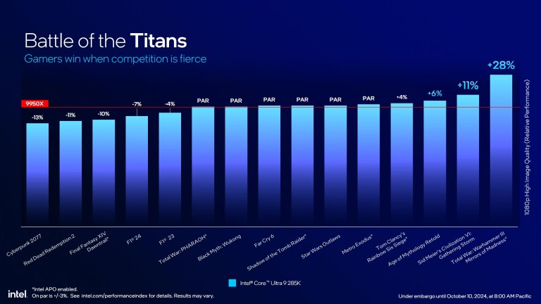 Thế nên, tuy có cùng số nhân như i9 14900K, nhưng số luồng Ultra 9 285K có thể chạy được thấp hơn đáng kể (24 vs. 32 luồng). Và đáng nói hơn đa số các con số hiệu năng mà Intel thể hiện chủ yếu loanh quanh với các tựa game, hầu như ít nhắc tới các ứng dụng khác (nếu có chủ yếu dính tới AI). Trong đó nhiều con số có được khi áp dụng Intel APO (Application Performance Optimization), có nghĩa nó không phản ánh điều kiện sử dụng thực tế của người dùng.