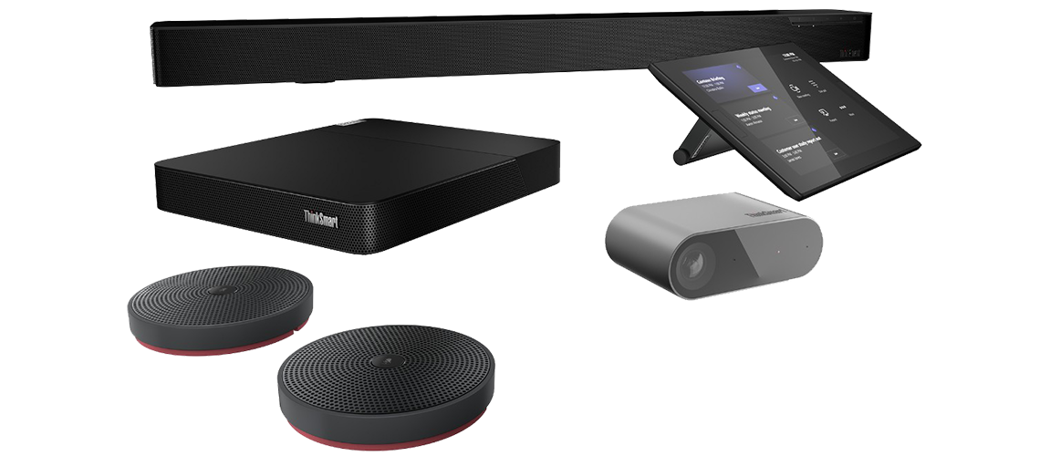 - ThinkSmart Core Full Room Kit: bộ điều khiển và thiết bị ThinkSmart Core được ghép nối với máy quay ThinkSmart Cam và loa ThinkSmart Bar, cho hình ảnh video chất lượng cao và âm thanh sống động cũng như các tính năng thông minh hơn để nâng cao trải nghiệm cộng tác. Hỗ trợ hoàn hảo cho phòng họp có không gian nhỏ hay văn phòng tại nhà, hệ thống thiết bị này có thể được mở rộng bằng cách bổ sung micro bàn.