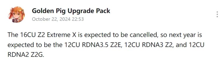 Cũng theo nguồn trên, ban đầu AMD còn định có thêm bản Z2 Extreme X trang bị tới tận 16 CU. Song có vẻ nó ngốn quá nhiều điện và toả ra nhiều nhiệt cho một chiếc handheld cầm tay, nên model này không được phát triển tiếp. Do đó chúng ta còn lại 3 model cùng có 12 CU xử lý đồ hoạ.
