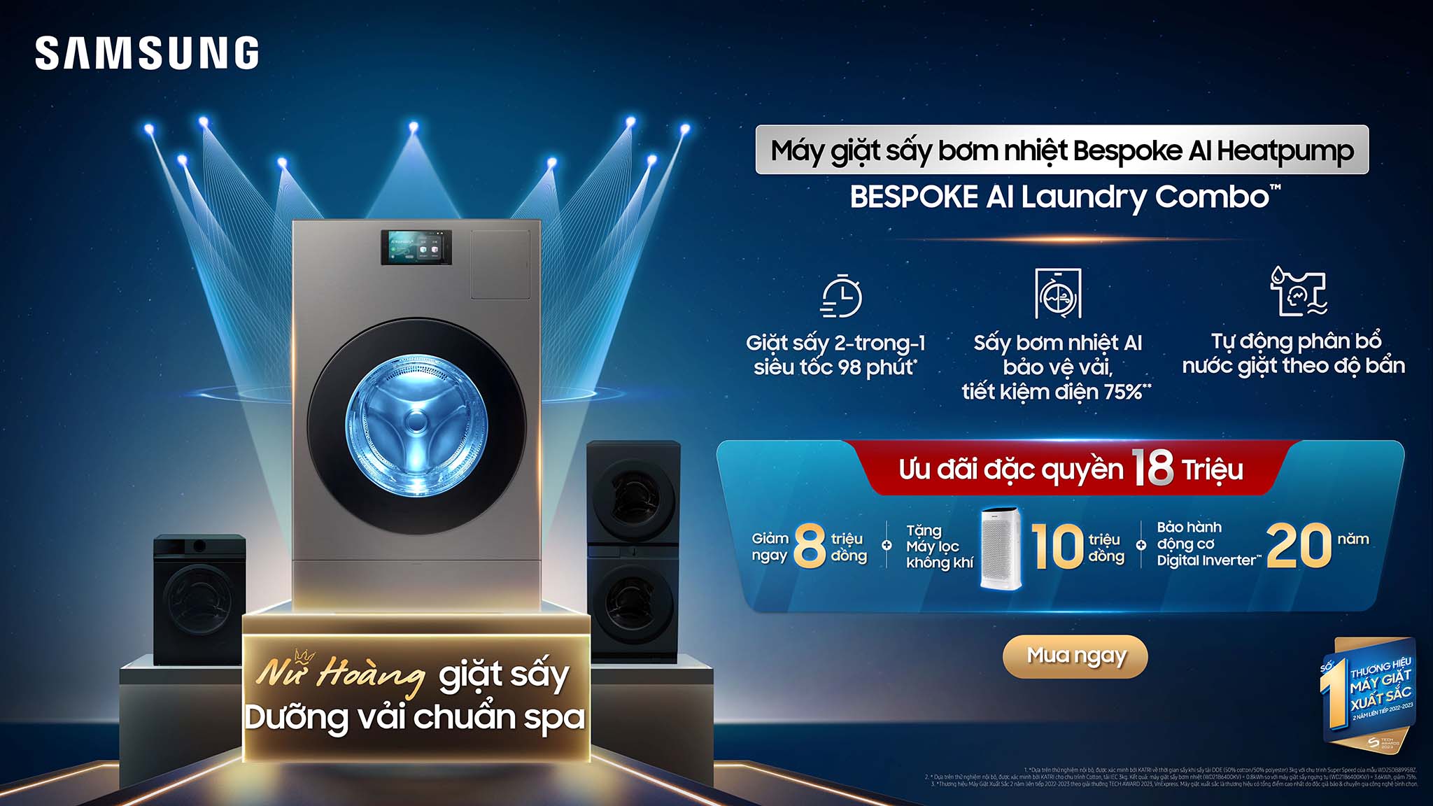 Máy giặt sấy bơm nhiệt Samsung Bespoke AI Heatpump chính thức được mở bán tại thị trường Việt Nam với giá 75,990,200 đồng cùng chương trình đặt hàng sớm, bắt đầu từ ngày 9/9/2024. Theo đó, nhiều ưu đãi hấp dẫn dành tặng cho những khách hàng đầu tiên sở hữu máy giặt sấy bơm nhiệt Samsung Bespoke AI Heatpump tại Việt Nam, gồm: giảm giá 8,100,021 đồng, còn 67,890,179 đồng, tặng máy lọc không khí Samsung trị giá 10 triệu đồng cùng chính sách bảo hành động cơ 20 năm.
