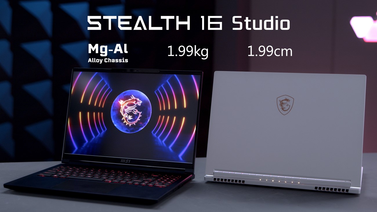 Phiên bản mới với thiết kế độc đáo, Stealth 16 Studio và Stealth 14 Studio là 2 sản phẩm vừa đạt giải thưởng tại triển lãm CES 2023 vừa qua. Máy có 2 tùy chọn màu sắc gồm trắng (Pure White) và xanh (Star Blue). Mẫu MSI Stealth 16 Studio có bộ khung được làm từ hợp kim nhôm - magie cứng cáp, tổng trọng lượng chưa đến 2 kg và độ dày chỉ 19.95 mm, dễ dàng mang theo trong khi di chuyển. MSI Stealth 14 Studio là laptop màn hình 14 inch có cấu hình mạnh nhất hiện nay, trang bị tản nhiệt buồng hơi để cung cấp hiệu năng tốt nhất cho game hay đa nhiệm di động mượt mà.