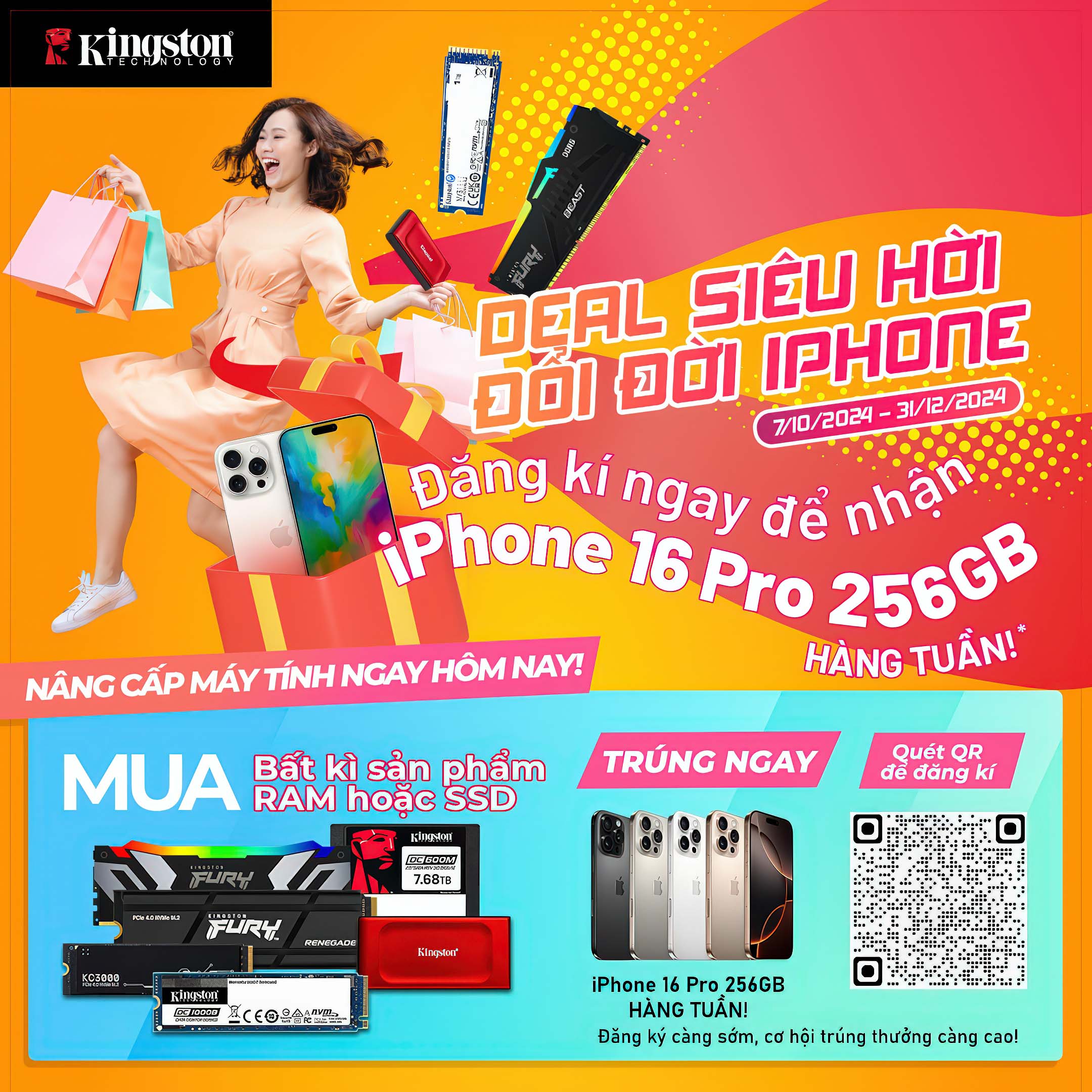 Khách hàng tại Việt Nam khi mua các sản phẩm Kingston sẽ có cơ hội sở hữu điện thoại iPhone 16 Pro 256 GB thông qua chương trình may mắn.