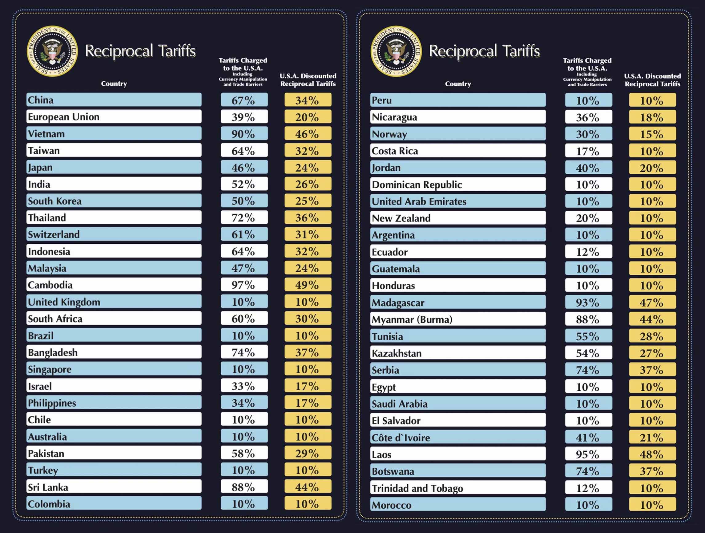 Dĩ nhiên tính theo cách mà Trump công bố, mức thuế suất đối ứng này không đồng nhất mà thay đổi tùy theo quốc gia. Chẳng hạn như Đài Loan - “vùng đất hứa” của bán dẫn - sẽ chịu mức thuế 32%, trong khi Trung Quốc chịu mức thuế 34%, được áp dụng thêm vào 20% thuế đã có trước đó, đồng thời có khả năng tăng thêm 50% nữa. Ngay cả Việt Nam cũng sẽ phải chịu mức thuế tới 46%, còn các quốc gia ở lục địa già thì chịu 20% thuế áp dụng cho 1 số mặt hàng, trong đó có cả xe hơi. Mexico không phải chịu thuế cho những hàng hóa tuân thủ USMCA, tùy thuộc quy tắc xuất xứ, ngược lại nếu không tuân thủ USMCA thì mức thuế là 25%.