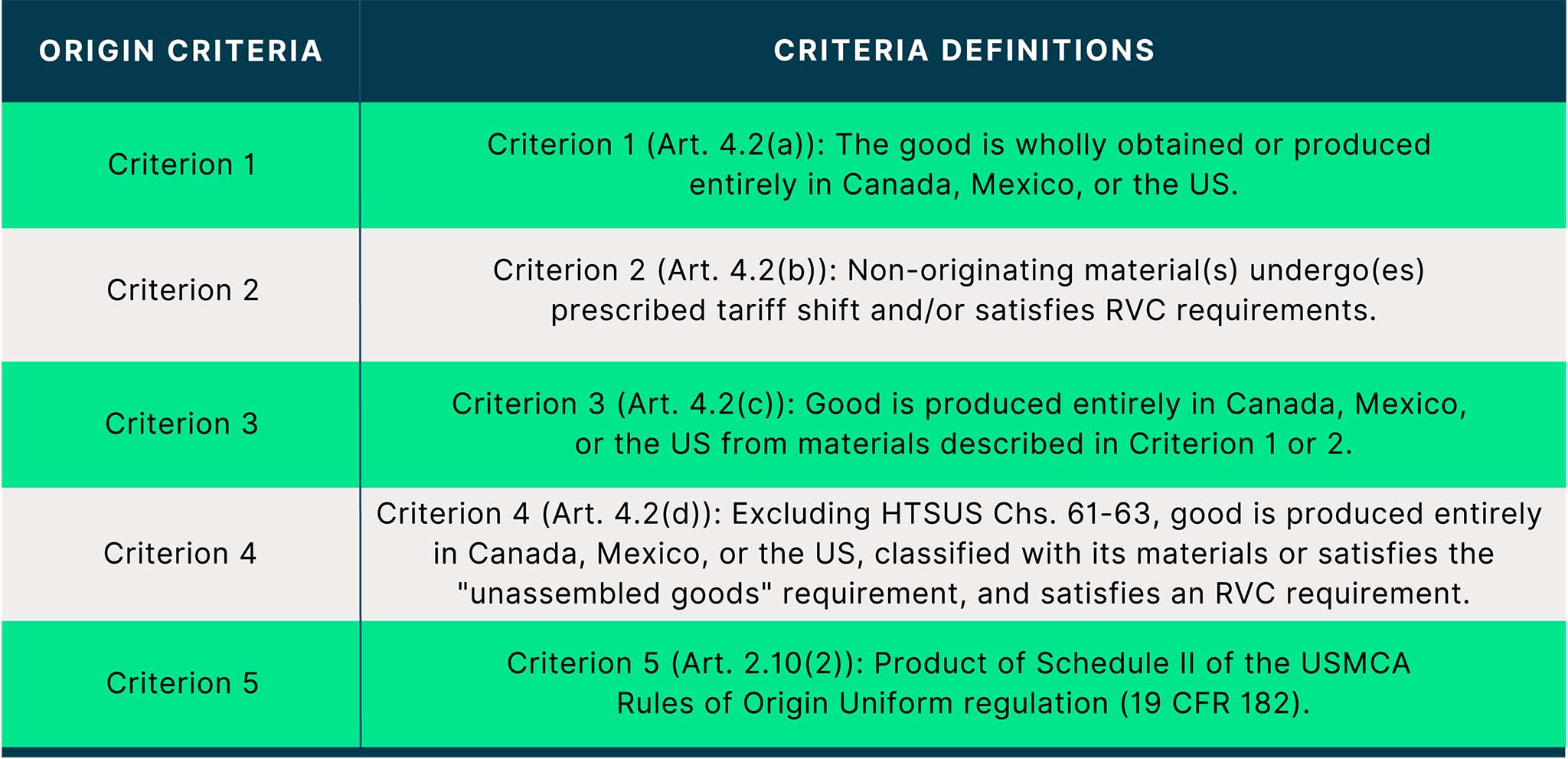 Để được miễn thuế, hàng hóa phải đáp ứng quy tắc xuất xứ của USMCA, trong khi các quy tắc này không đơn giản mà rất phức tạp và khác nhau tùy thuộc vào từng loại sản phẩm cụ thể. Để một sản phẩm được coi là có xuất xứ từ một quốc gia thành viên USMCA, sản phẩm đó có thể phải đáp ứng 1 trong các tiêu chí sau: