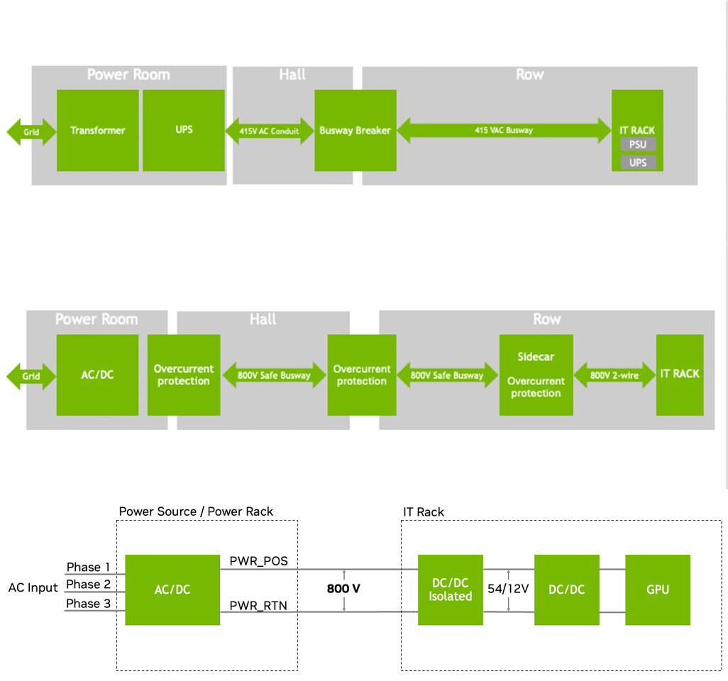 Trước viễn cảnh đó, hãng chip AI này đề xuất mô hình cung cấp điện mới, sử dụng điện áp cao một chiều 800 V HDVC để thay thế hệ thống 54 V hiện tại. Cụ thể ở mô hình cũ, điện xoay chiều cao/trung thế từ mạng lưới được hạ thế xuống còn 415 V AC hoặc 480 V DC, rồi từ đây mới đi qua 200 kg Cu/rack nêu trên để vận hành cỗ máy. Nhưng ở mô hình 800 V HDVC, điện xoay chiều từ mạng lưới vừa được hạ thế, vừa được chuyển đổi tại chỗ sang 800 V DC, dòng điện mới có thể được dùng trực tiếp cho cỗ máy mà không cần tới PSU/USP như hiện tại.