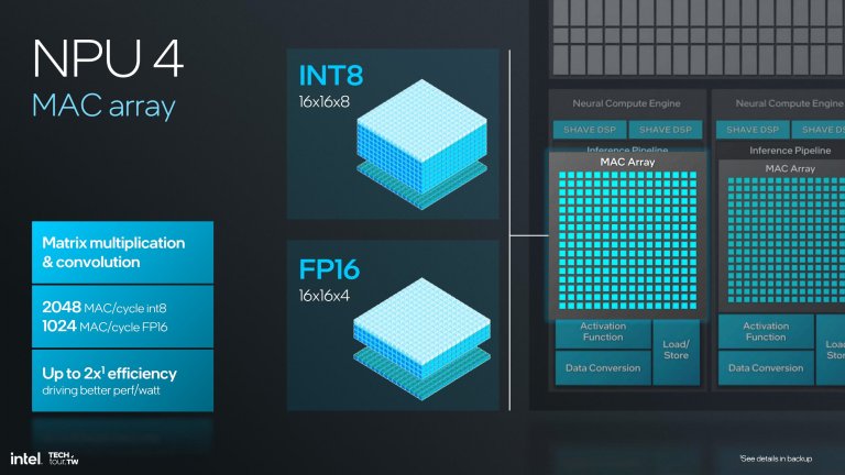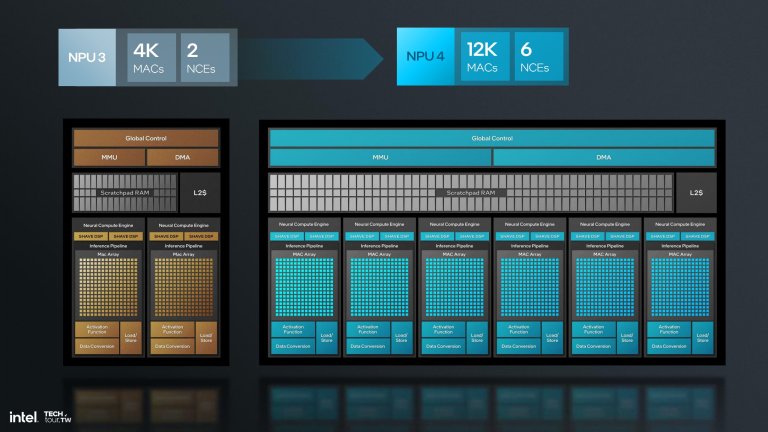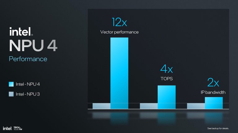 Đáng giá chung, Intel cho biết NPU4 có hiệu suất tính vector gấp 12 lần NPU3 (cũng hợp lý vì SHAVE DSP được cải tiến nhiều nhất), hiệu năng TOPS tăng 4 lần và băng thông dữ liệu tăng gấp đôi.