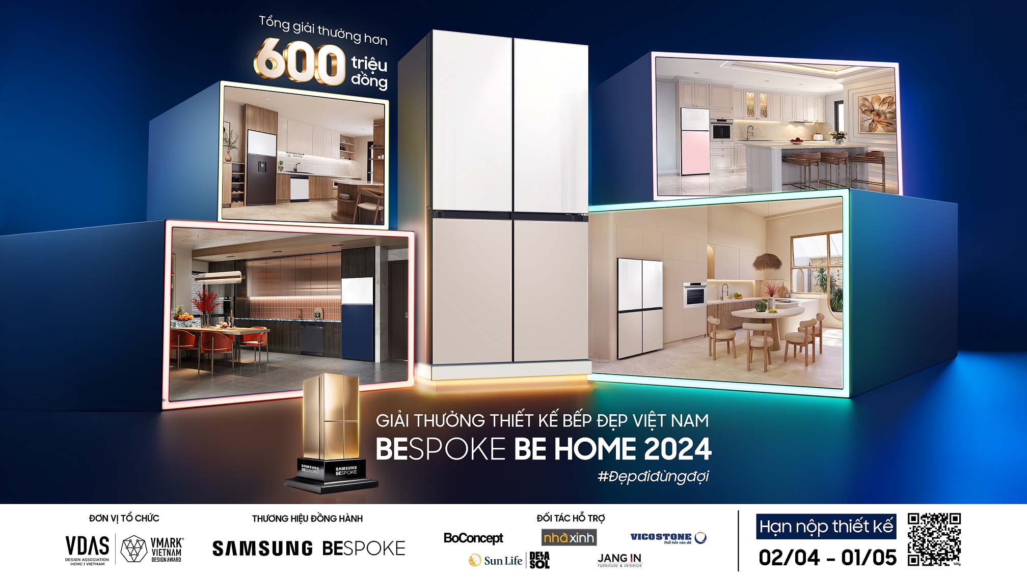 Samsung Bespoke đồng hành cùng giải thưởng với bộ sưu tập gồm Tủ lạnh, Máy rửa bát, Bếp từ, Máy hút mùi, Lò nướng. Tổng giá trị giải thưởng hơn 600 triệu đồng, diễn ra từ ngày 2/4/2024 đến ngày 27/6/2024. Tác phẩm dự thi sẽ được hội đồng giám khảo gồm các chuyên gia uy tín từ các lĩnh vực thiết kế nội thất, kiến trúc, đại diện tổ chức và cơ quan truyền thông đánh giá dựa trên các tiêu chí: tính thẩm mỹ, công năng, ý tưởng độc đáo và ứng dụng bộ sưu tập Samsung Bespoke.
