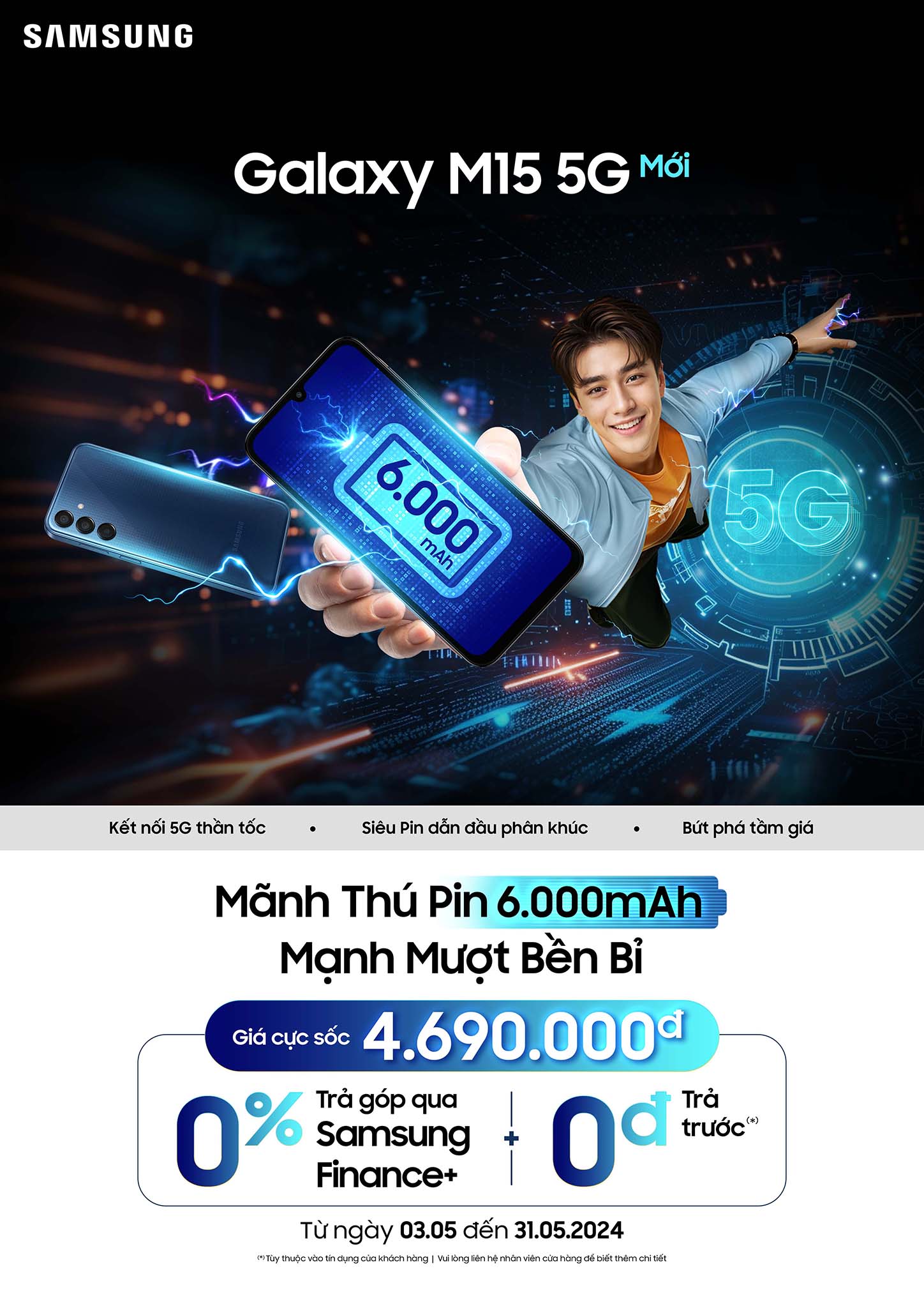 Galaxy M15 5G chính thức mở bán tại Việt Nam từ ngày 3/5/2024 với mức giá tương ứng bản RAM 4G + 128 GB lưu trữ là 4,690,000 đồng, RAM 6 GB + 128 GB lưu trữ là 4,990,000 đồng.
