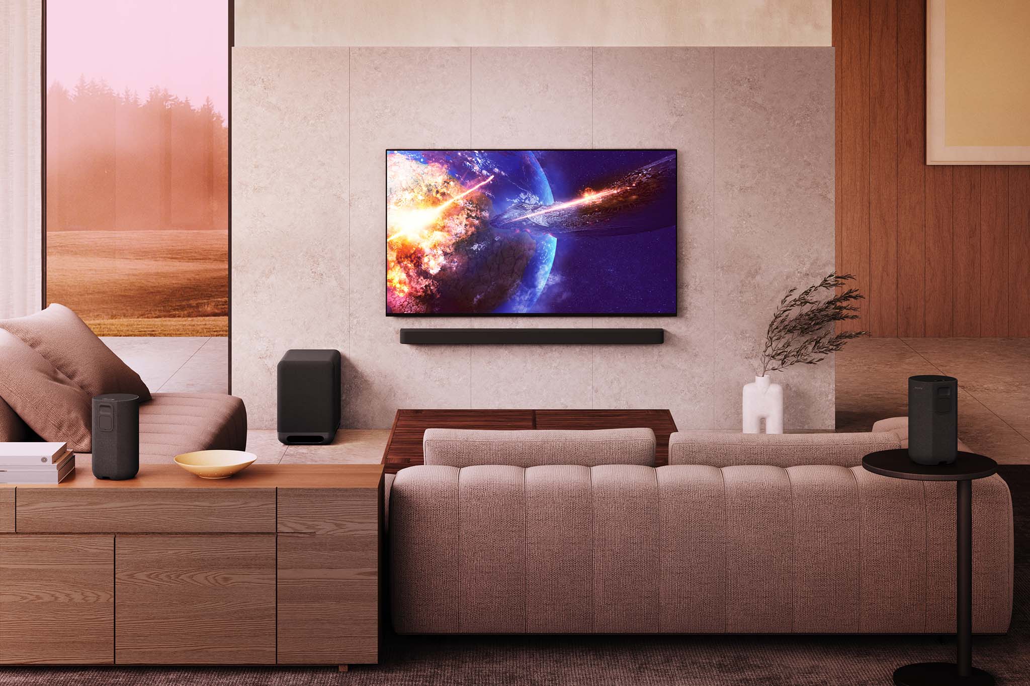 Với Sony BRAVIA Theatre Bar 9 và Bar 8, người dùng đã sẵn sàng cho những trải nghiệm nội dung chất lượng cao (Hi-Res Audio, 360 Reality Audio, 8K HDR, và 4K 120) cùng các chuẩn âm thanh điện ảnh hiện đại nhất như IMAX Enhanced, DTS:X và Dolby Atmos. Khi kết hợp loa thanh BRAVIA Theatre với TV Sony BRAVIA, trải nghiệm xem phim rạp tại gia được hoàn thiện hơn nhờ tính năng Accoustic Center Sync. TV trở thành loa trung tâm, được điều chỉnh hài hòa và tự nhiên hơn với âm thanh từ Soundbar, tạo nên bộ âm đồng nhất. Sự kết hợp này còn linh hoạt với ba cách lắp đặt mới: treo tường, để bàn che chân TV hoặc để giữa.