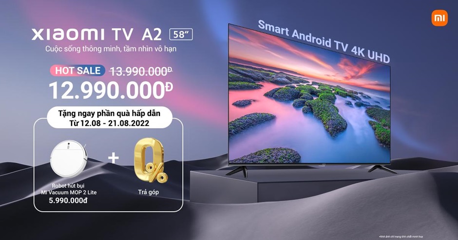 Tại Việt Nam, Xiaomi TV A2 58 inch có giá 13,990,000 đồng. Chương trình ưu đãi đặc biệt cho khách hàng trong khoảng từ 12/8 đến hết 21/8 sẽ giảm ngay 1 triệu đồng, chỉ còn 12,990,000 đồng. Ngoài ra, khi mua Xiaomi TV A2 58 inch trong thời gian này, người dùng còn nhận thêm Mi Robot Vacuum-Mop 2 Lite trị giá 5,990,000 đồng và chương trình trả góp với 0% lãi suất.