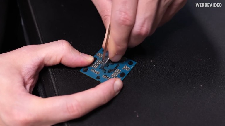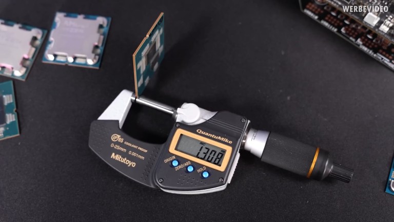 Thứ hai là phần nhựa resin bọc chung quanh dùng để bảo vệ các tụ điện. Hàng "real" dĩ nhiên sẽ có. Nhưng con hàng "fake" trong tay Der8auer thì không. Bên cạnh đó, con chip giả gắn vào socket AM5 dễ dàng hơn (LGA yêu cầu phải có chốt ngàm đè chặt lên trên chip), Der8auer mất ít sức hơn để đè chốt gắn. Lý do đằng sau việc này là vì con chip giả mỏng hơn chip thật. Trong khi PCB chịp thật dày hơn 1.3 mm thì chip giả chỉ chưa tới 1 mm!